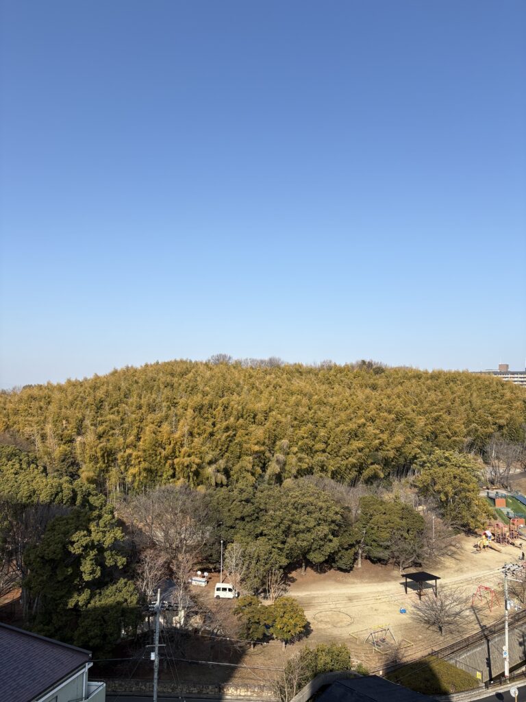 窓から降りそそぐ日光と、窓の向こうに広がる緑地公園の竹林の緑の景色に思わず見とれてしまいました。